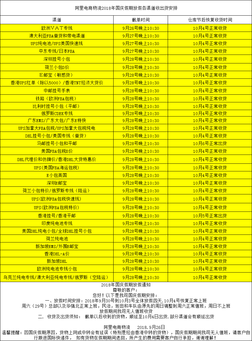 通知 尊敬的客戶: 關(guān)于FBA包稅以及鐵路包稅渠道通知 您好!圣誕節(jié)假期:12月22日--12月26日,圣誕期間歐洲的清關(guān)和派送都會(huì)受到節(jié)假日的影響,相...[查看詳細(xì)]