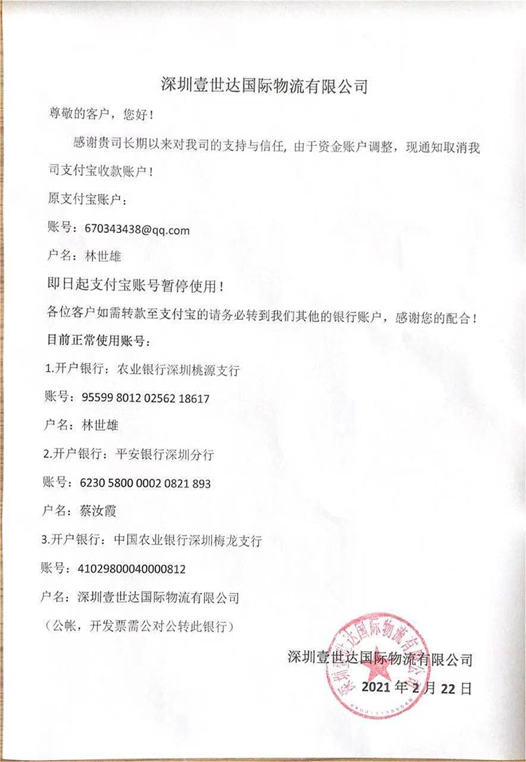 戶名:深圳壹世達(dá)國際物流有限公司