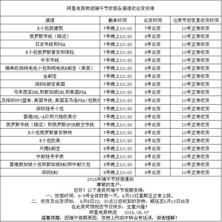 阿里電商物流關于端午節(jié)放假各渠道收出貨安排如下: