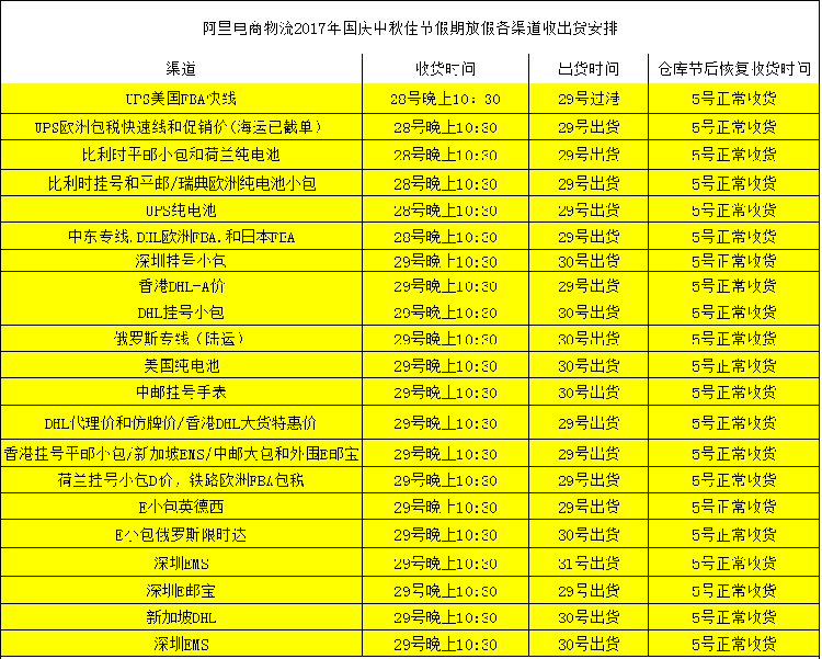 放假期間各渠道截單及恢復(fù)出貨時(shí)間: