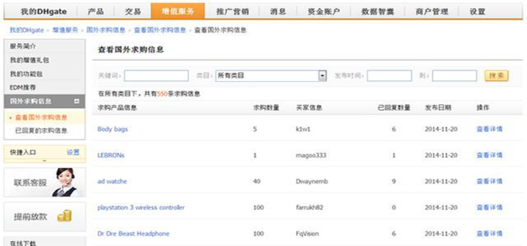 在敦煌網(wǎng)上,賣家進入“我的DHgate”,點擊“增值服務(wù)--國外求購信息”,在這里可以查看到部分外國客戶的求購信息,對于賣家選品也有一定的參考價值。