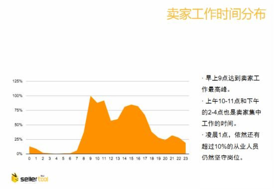 做跨境電商的有多不易,看看下面你就清楚,凌晨1點依然還有10%的賣家在堅守崗位。早上9點是賣家工作高峰期,上午10-11點和下午2-4點也是賣家集中工作時間。