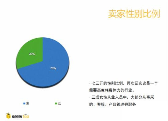 在賣家性別比例中,男女比例七三開,在女性從業(yè)人員中,大部分從事采購、客戶、產(chǎn)品管理等職務(wù)。