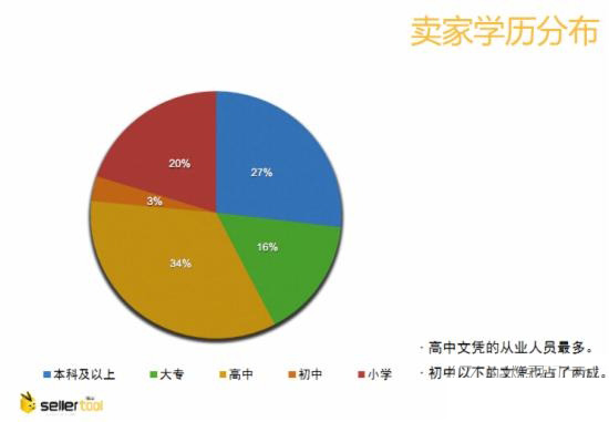在很多人眼里,做出口電商應(yīng)該都是高學(xué)歷的的人,但從公布的數(shù)據(jù)來看并非如此,從該數(shù)據(jù)看,高中文憑的從業(yè)人員占比最大,其次分別是本科、大專、初中更讓你想不到的居然還有小學(xué),而且占比高達(dá)20%。等等,小學(xué)文憑也能做跨境電商,小編我真不敢想象,我和大家一樣,一直都認(rèn)為玩跨境電商的只有那些高學(xué)歷的人才能玩,沒想到---------。