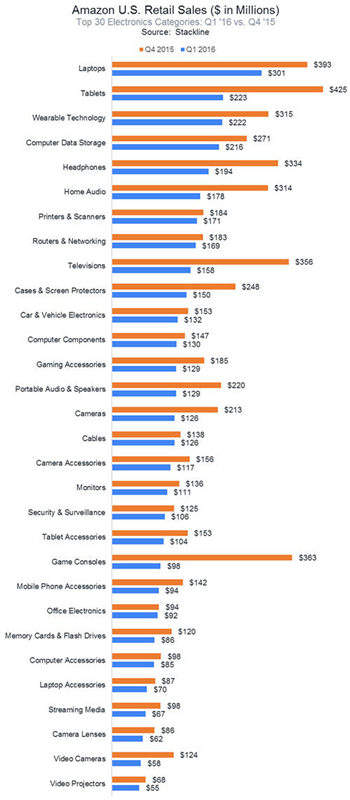 在消費(fèi)電子產(chǎn)品中,一些比較完善的產(chǎn)品線,比如筆記本電腦、計(jì)算機(jī)數(shù)據(jù)存儲(chǔ)器和耳機(jī),產(chǎn)生的收益最大。而可穿戴技術(shù)和游戲配件對(duì)亞馬遜銷量的提升起了很大推動(dòng)作用。
