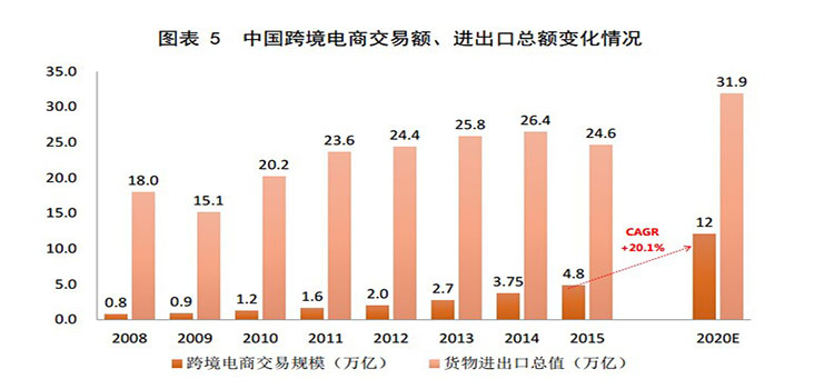 數(shù)據(jù)顯示,預(yù)計(jì)到2020年,中國跨境電商交易規(guī)模將達(dá)12萬億元,占中國進(jìn)出口總額的約37.6%;中國跨境電商零售交易額將超過3.6萬億元,年均增幅約37%,預(yù)計(jì)2020年跨境電商零售占比將超過30%。