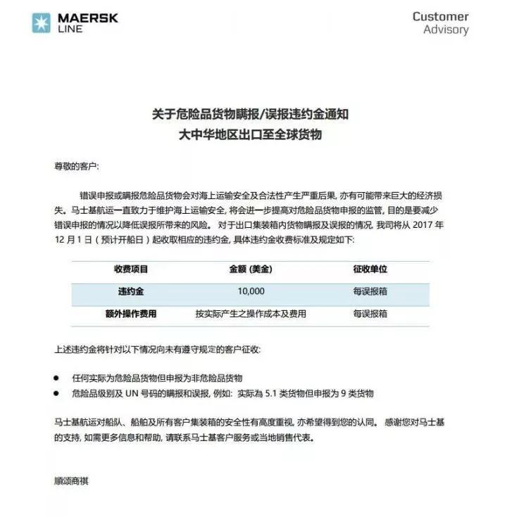 通知中寫明,對(duì)集裝箱內(nèi)危險(xiǎn)品瞞報(bào),錯(cuò)誤申報(bào)貨物的危險(xiǎn)性質(zhì)的客戶,收取違約金每自然箱10000美金;此外,每個(gè)誤報(bào)箱還將按照實(shí)際操作所產(chǎn)生的費(fèi)用和成本,收取額外的補(bǔ)貼費(fèi)用;此舉旨在共同創(chuàng)建和諧、安全的貨物運(yùn)輸環(huán)境。 12月起危險(xiǎn)品管控升級(jí)!馬士基和薩非航運(yùn)將對(duì)瞞報(bào)誤報(bào)者征收違約金