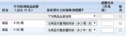 在這里大家可以看到,這個(gè)功能可以用兩個(gè)條件來設(shè)置補(bǔ)貨提醒,一個(gè)是庫存數(shù)量減少到多少件的時(shí)候提醒,另外一個(gè)是根據(jù)你過去30天每周銷量來設(shè)定。比如目前采購(gòu)需要一周,發(fā)貨可能1-2周,亞馬遜目前FBA倉(cāng)庫比較緊張要1周,那么我們就可以設(shè)置成4周。